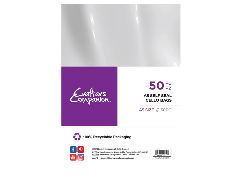 Protective storage - Crafter’s Companion Self Seal Cello Bags - A5 includes 50 clear cello bags. Each bag is perfectly sized to hold and provide a protective cover for A5 sized cards and envelopes. Keep treasured cards safe and protect finished makes until they’re ready to send off.