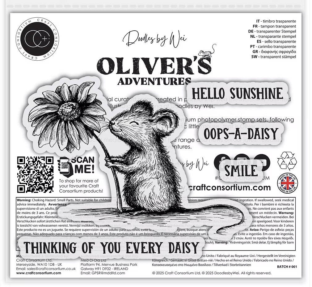 Celebrate creativity with the Oliver's Adventures – Daisy Clear Photopolymer Stamp Set, exclusively from Doodles by Wei and Craft Consortium. Featuring enchanting pen & ink illustrations by Wei, this set brings the whimsical world of Oliver the mouse to your craft projects.