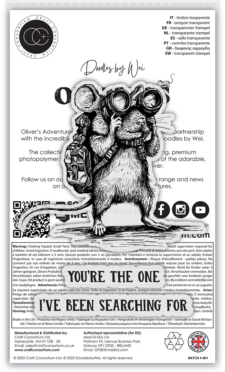 Discover whimsical creativity with the Oliver's Adventures – Searching Clear Photopolymer Stamp Set, exclusively from Doodles by Wei and Craft Consortium. This charming set features adorable illustrations by Wei, a renowned pen & ink artist from Long Island, New York, known for her lively and amusing characters like Oliver the mouse.