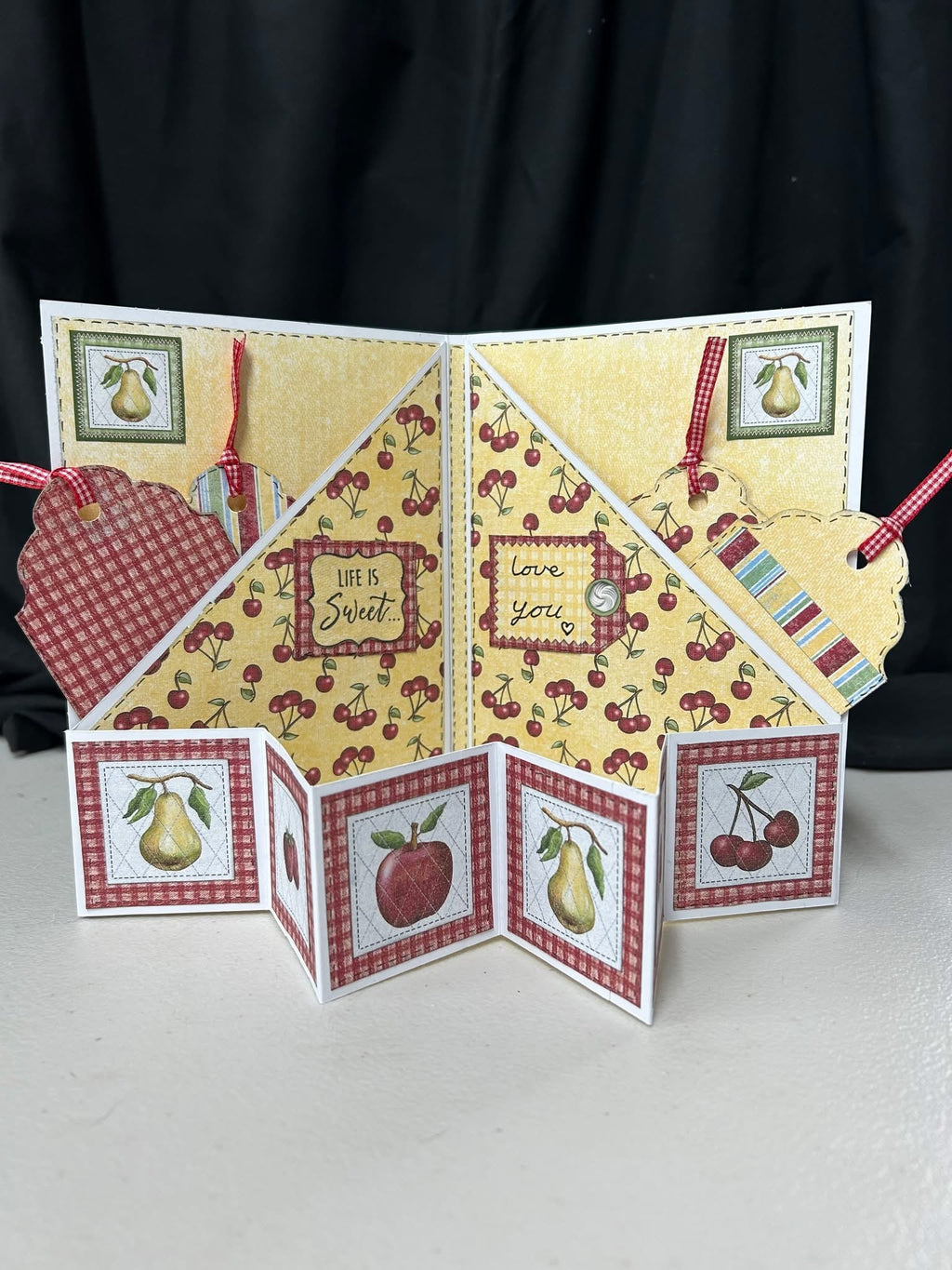 A 5" x 7" interactive card that opens to reveal two centre-to-edge diagonal pockets and a 6-panel accordion fold (perfect for six photos or six message/decorative panels).