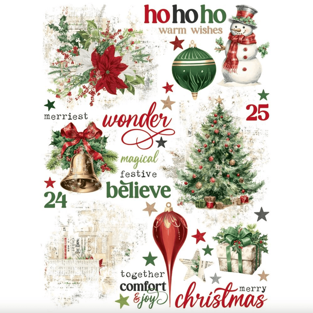 Simple Vintage Believe 6x8 Rub-On Transfers by Simple Stories offer an elegant way to add festive charm to your holiday crafts.